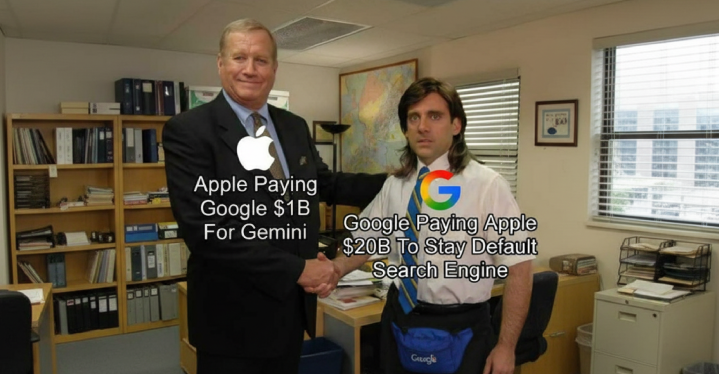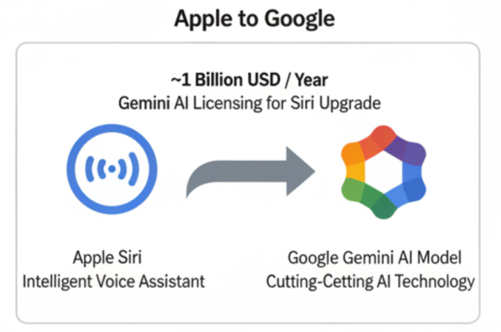 苹果购买Gemini调用权:苹果反向向长期对手谷歌支付约10亿美元,换取谷歌尖端AI模型Gemini的授权,用于彻底升级自家智能语音助手Siri。