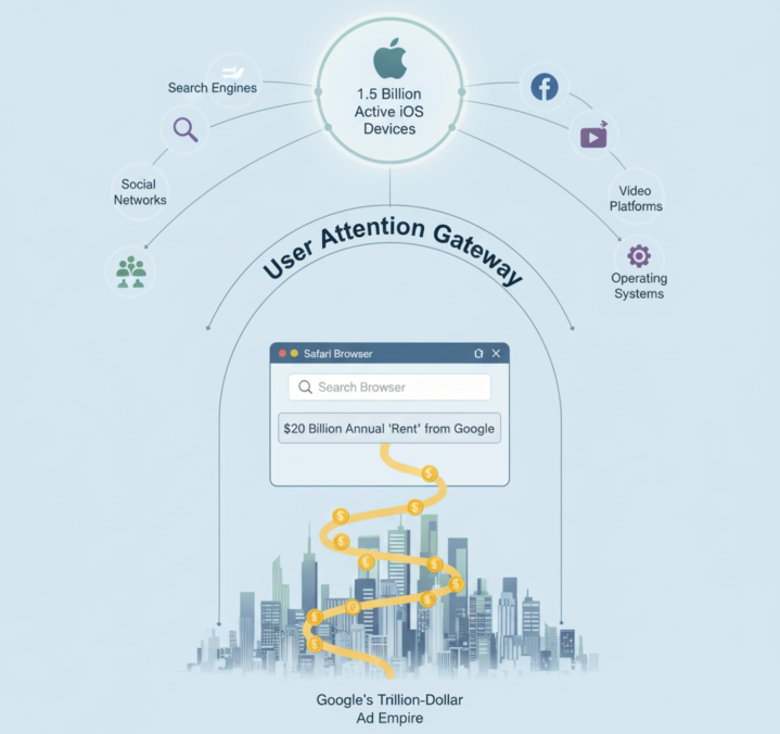 这是整个系统的起点——所有互联网服务,无论搜索引擎、社交网络、视频平台还是操作系统本身,核心使命之一都是吸引并留住用户的注意力。苹果手握超过15亿台活跃iOS设备,这些设备构成了全球高价值用户群体的核心注意力入口。谷歌每年支付的200亿美元,本质上就是对这一顶级注意力入口的“租金”,而Safari浏览器上那个小小的搜索框,正是通往谷歌万亿广告帝国的黄金通道。