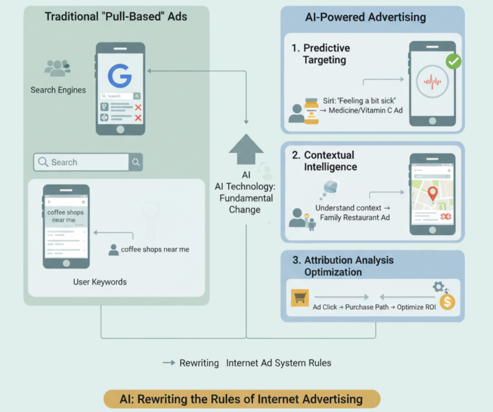 传统广告投放依赖用户主动输入的关键词,属于“拉式”广告;AI技术带来了根本性变革: