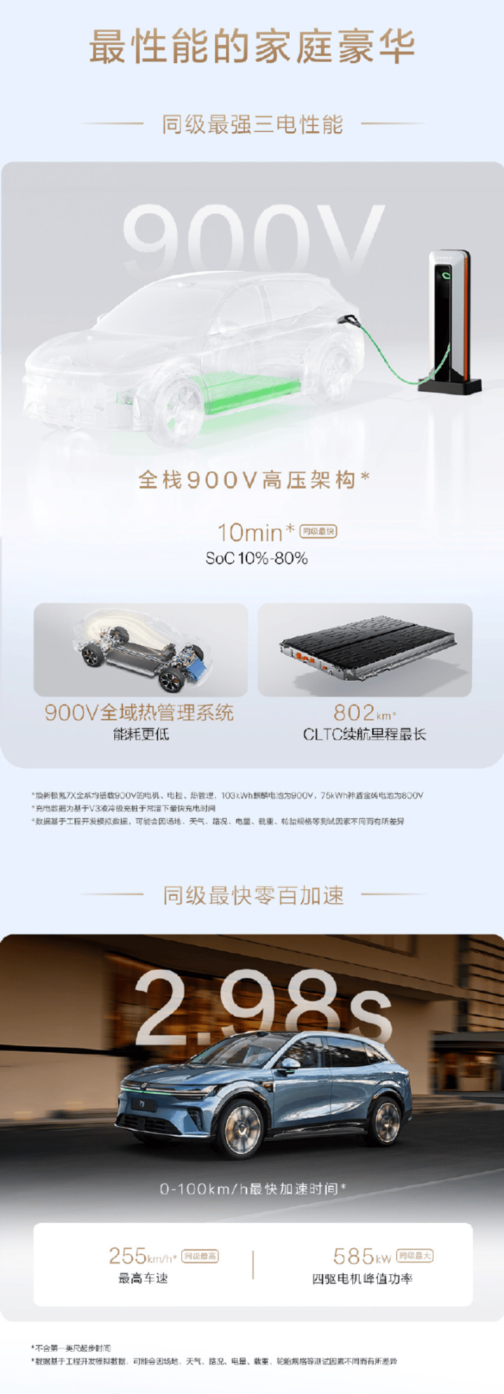 新车升级全栈900V高压架构,可在10分钟内从10%电量充至80%,CLTC续航里程最长可达802km;双电机车型零百加速仅2.98秒,四驱电机峰值功率585kW,最高车速255km/h。